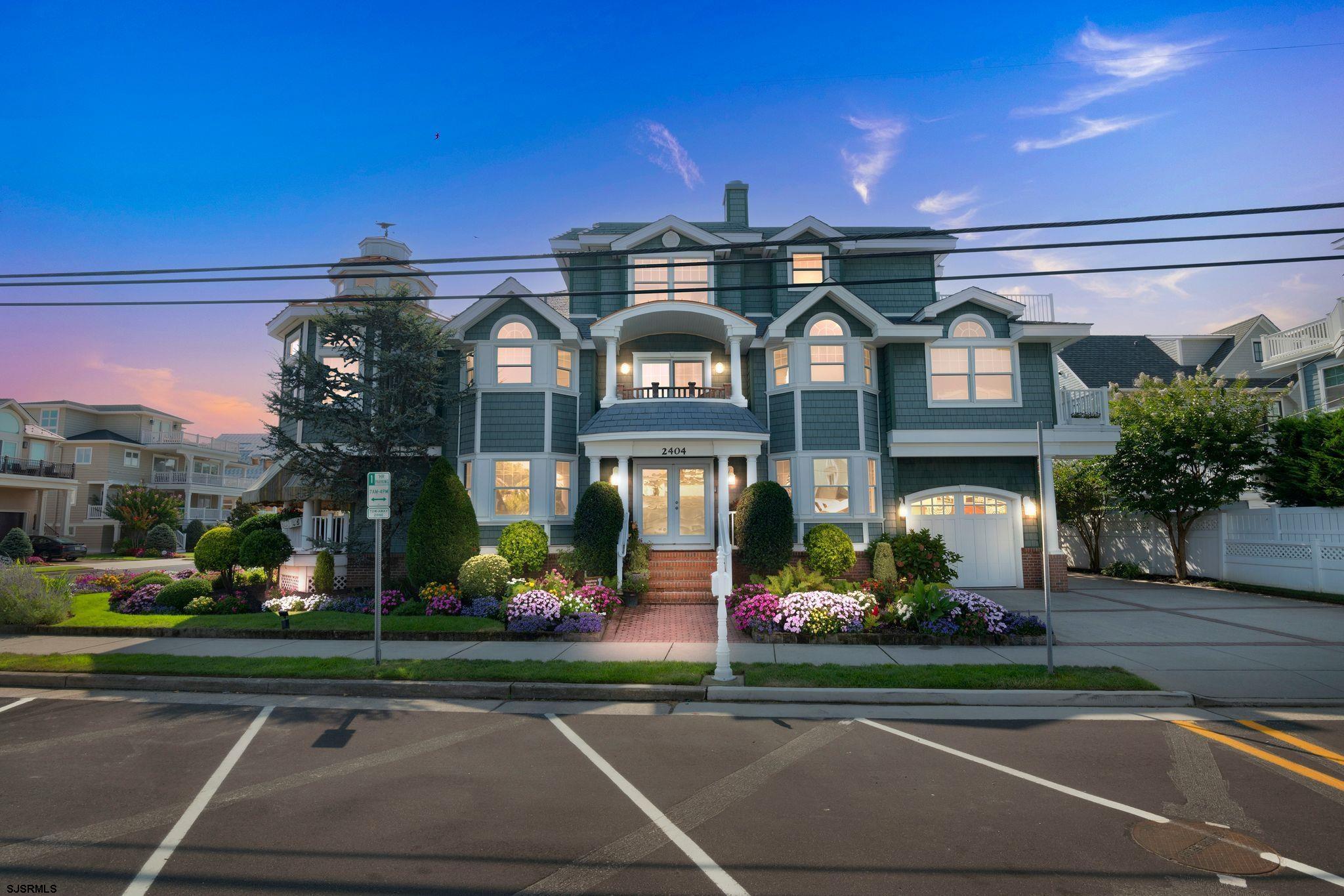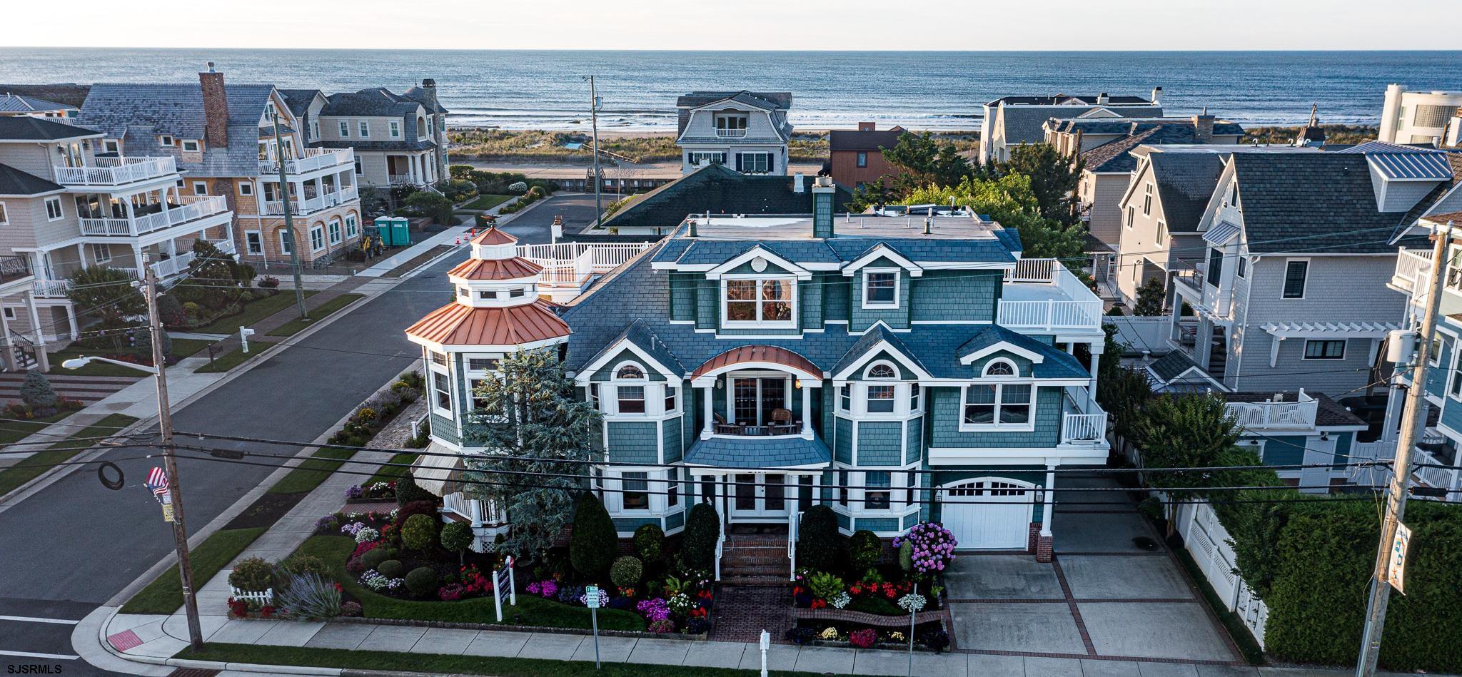 Welcome to 2404 Atlantic Avenue, Longport, NJ a custom built beach house of coastal design. This beautifully landscaped beach block corner property is situated on approximately 53' x 90' lot containing 5 bedrooms plus den office, and 5.5 baths with ocean and bay views. Stepping into the main entrance, you will be greeted by a spacious light-filled area and a comfortable den leading to the cozy covered front porch. Also on the first level are 2 guest bedrooms, 2 baths, office bedroom, laundry room, attached garage and a convenient 4 stop elevator. The second level features a gourmet kitchen complete with Viking Range, Sub Zero Refrigerator, Miele Dishwasher and a walk in pantry. The creative floor plan includes a circular dining area with a dramatic vaulted beamed ceiling and sun filled windows. The main living area seamlessly flows onto one of 6 decks perfect for entertaining. Also featured is a gas fireplace surrounded by beautiful stone complemented by a separate wet bar area. Also on this level are 2 Ensuite bedrooms, a second laundry area and a powder room. The coastal style continues to the primary suite on the third level with sliding glass doors leading to breathtaking ocean and bay views from the private roof deck. The primary suite also contains a wood burning fireplace, a separate office and a luxurious bathroom with soaking tub and shower. This seashore retreat is located just steps to one of Longport s finest beaches and the Atlantic Ocean. A truly unique opportunity to enjoy a relaxed life style by the sea.