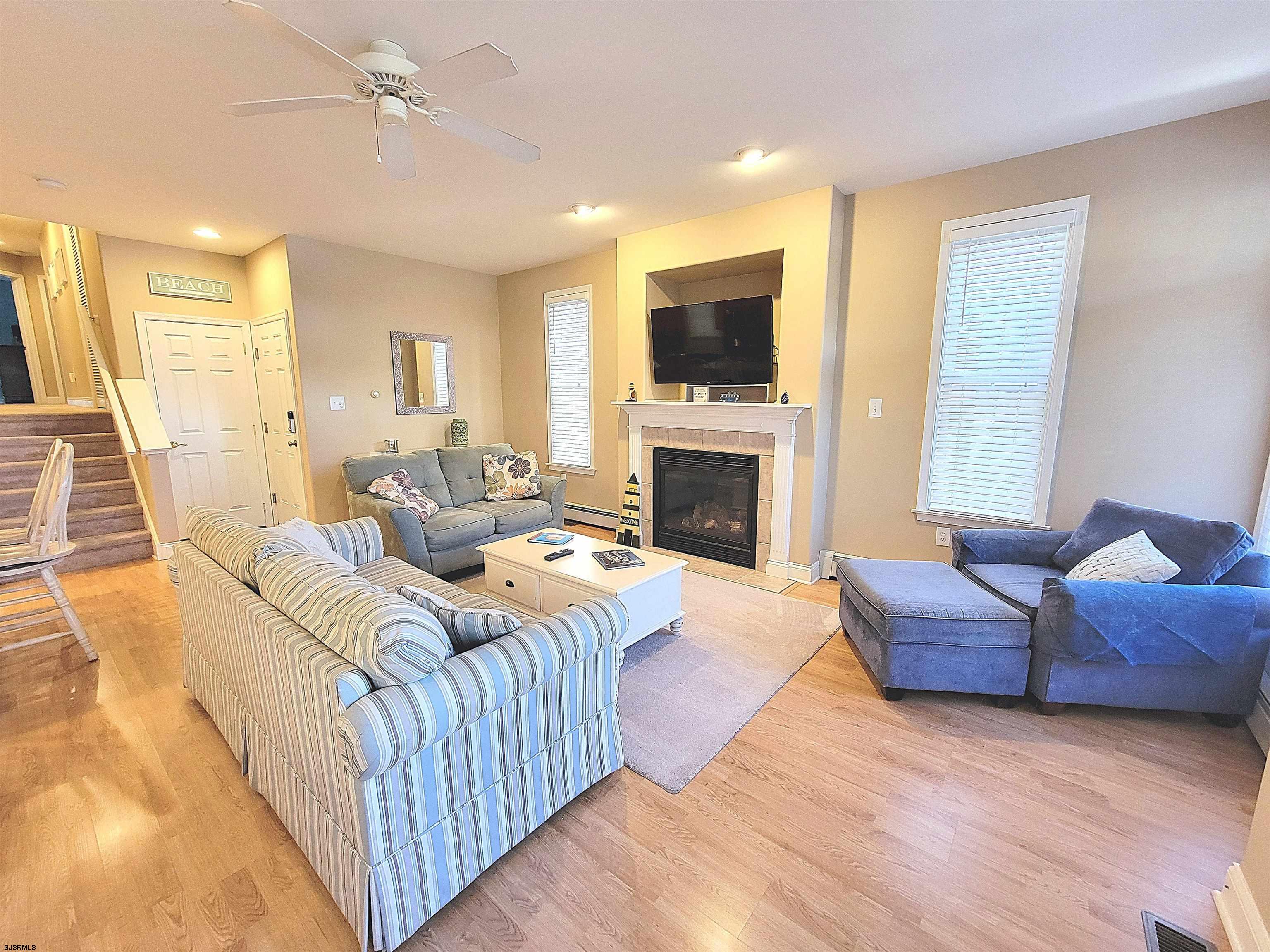 Experience the best of coastal living in this beautiful custom-built 3-bedroom, 2-bath fully furnished first floor, ideally located just moments from the beach and boardwalk, restaurants and stores, playground. This elegant first-floor residence combines comfort, convenience, and craftsmanship, featuring high ceilings, transom windows, and a warm gas-log fireplace that adds charm to the open living space. Ceiling fans in living area and all three bedrooms. The upgraded kitchen offers modern finishes, stainless steel appliances, gas oven, and plenty of workspace, perfect for entertaining family and friends. With two separate entrances one from the large covered front porch and another from the side stairwell you ll enjoy easy access and privacy. Relax on the full size front covered deck, or rear deck. Store your beach gear in the enclosed garage with storage closet, and take advantage of the outdoor shower after a day in the sun. This inviting coastal retreat offers the perfect blend of style and practicality, ready to be enjoyed year-round or as an exceptional vacation home. Excellent rental history too.